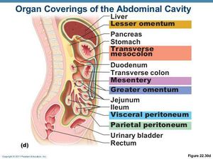The intraperitoneal organs are the stomach, spleen, liver, bulb of the duodenum, jejunum, ileum, transverse colon, and sigmoid colon. The retroperitoneal organs are the remainder of the duodenum, the cecum and ascending colon, the descending colon, the pancreas, the kidneys and urinary bladder