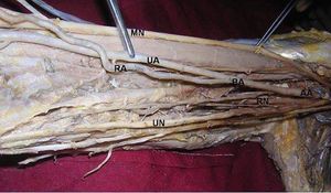 Photograph of high bifurcation of the brachial artery πAA - axillary artery πBA - brachial artery πUA - ulnar artery πRA - radial artery πMN - median nerve πUN - ulnar nerve πRN - radial nerve.