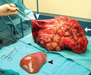A 51-year-old woman with polycystic liver and kidney disease had undergone renal transplantation 21 years before presentation. She had no evidence of cerebrovascular malformations. Both her father and aunt also had polycystic kidney disease. After the renal transplantation, her liver had become progressively diseased and enlarged through cystic changes. Early satiety, malnutrition, and abdominal pain necessitated a liver transplantation. A 9.1-kg liver (white arrow) was removed and replaced with a whole graft that was one tenth the weight of the diseased liver (black arrowhead). A large cyst at the dome of the native liver had to be decompressed (white arrowhead) to allow for access to the recipient's suprahepatic vena cava. She made an excellent recovery and had normal kidney and liver function at 4 years of follow-up.