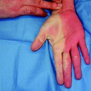 The patient is asked to clench both fists tightly for 1 minute at the same time. Pressure is applied over both radial arteries simultaneously so as to occlude them. The patient then opens the fingers of both hands rapidly, and the examiner compares the colour of both. The initial pallor should be replaced quickly by rubor. The test may be repeated, this time occluding the ulnar arteries. Allen's test looks for abnormal circulation. If color returns quickly as described above, Allen's test is considered to demonstrate normal circulation. If the pallor persists for some time after the patient opens their fingers, this suggests a degree of occlusion of the uncompressed artery.