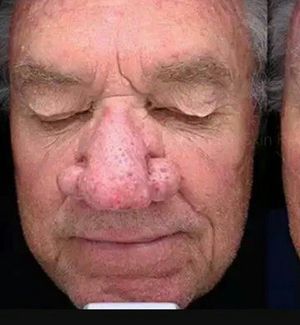 Rhinophyma is a condition causing development of a large, bulbous, ruddy nose associated with granulomatous infiltration, commonly due to untreated rosacea.