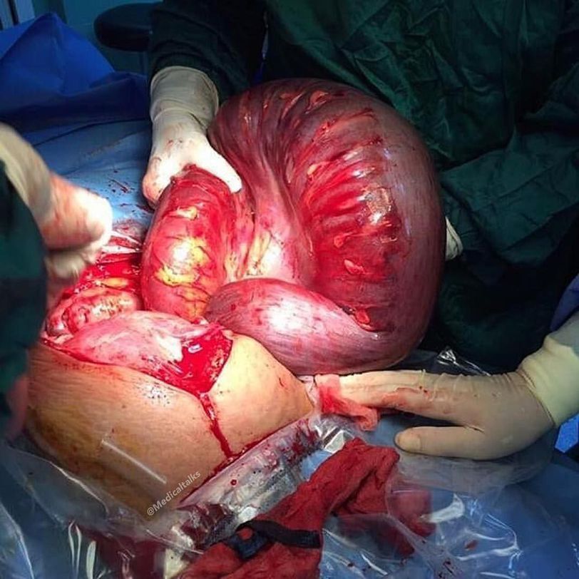 The image above shows a greatly dilated sigmoid colon that almost fills the entire abdomen! Intestinal obstruction due to sigmoid volvulus during pregnancy is rare. The presenting symptoms seen in these patients are the same as with non-pregnant patients - constipation, abdominal bloating, nausea and vomiting, with marked abdominal distention on examination. This condition occurs when the sigmoid colon twists around itself and its narrow and elongated mesentery and, not surprising, the obstruction of the intestinal lumen and impairment of vascular perfusion occur when the degree of torsion exceeds 180 and 360 degrees, respectively, leading to necrosis. Plain abdominal radiography showing the dilated loops often with a few air-fluid levels is used to diagnose the volvulus in most cases with CT scan or MRI as the confirmatory tests when necessary. Surgically, after the colon has been untwisted, resection of sigmoid colon and descending colon and primary anastomosis is performed. A nonresective alternatives is also widely used with mixed success. Rapid surgical involvement is mandatory to prevent complications such as hemorrhagic infarction, perforation, septic shock, and death.