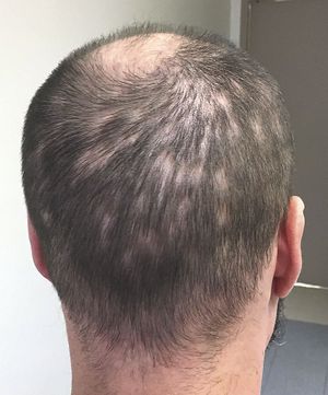A 35-year-old man with a history of bipolar disorder presented to the emergency psychiatry service with paranoid delusions. On physical examination, he was found to have patchy, irregular alopecia of the scalp and faint, erythematous macules with subtle scales on the trunk and the arms and legs. The rash was not apparent on the palms or soles. Aside from the mood disturbance, which was consistent with the patient’s previous psychiatric presentations, the results of the neurologic examination were normal. Laboratory tests revealed a rapid plasma reagin titer of 1:128, and the result of a confirmatory test for antibodies to Treponema pallidum was positive. A test for antibodies to the human immunodeficiency virus was negative. A nonscarring alopecia with a “moth-eaten” appearance is characteristic of secondary syphilis. Although syphilitic alopecia is uncommon, it may be the only manifestation of secondary syphilis observed on patient presentation. Hair typically regrows after antibiotic treatment. The patient received an intramuscular injection of penicillin G benzathine, and within days the rash resolved. His mood stabilized with treatment for bipolar disorder that included antipsychotic medications, and he was discharged home. He was subsequently lost to follow-up. Ata S. Moshiri, M.D., M.P.H. Alexander Moxam, M.D. Hospital of the University of Pennsylvania, Philadelphia, PA Source: nejm.org