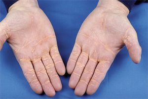 A 49-year-old man was referred to the metabolic clinic for evaluation of severe hypercholesterolemia and xanthomas, which were particularly prominent on the hands. The lesions were painful and affected the patient’s everyday life, making it difficult for him to open bottles or shake hands. He had a 2-year history of biliary cirrhosis due to ischemic cholangiopathy. Laboratory evaluations showed a total cholesterol level of 970 mg per deciliter (25.1 mmol per liter); a triglyceride level of 158 mg per deciliter (1.8 mmol per liter); a low-density lipoprotein (LDL) cholesterol level of 875 mg per deciliter (22.6 mmol per liter), with presence of lipoprotein-X; and a high-density lipoprotein cholesterol level of 64 mg per deciliter (1.7 mmol per liter). Treatment with LDL apheresis was started. Palmar xanthomas can also be seen in patients with type III hyperlipoproteinemia (familial dysbetalipoproteinemia). Xanthomas are rarely so severe that they interfere with activities of daily life. Within 3 months after the initiation of weekly LDL apheresis, the lesions had almost disappeared and the patient reported substantial relief from pain and improvement in function. At follow-up 10 years after presentation, the patient was in stable condition and was undergoing LDL apheresis every other week. Since the initiation of LDL apheresis, his LDL cholesterol level had decreased to 110 mg per deciliter (2.8 mmol per liter). Source: nejm.org