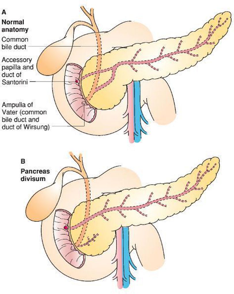 šŗ Pancreatic divisum is a congenital anomaly in the anatomy of the ducts of the pancreas in which a single pancreatic duct is not formed, but rather remains as two distinct dorsal and ventral ducts. šŗ A majority of individuals born with pancreas divisum will not have symptoms. In some cases, pancreas divisum is only detected during autopsy.A small group of individuals will develop symptoms which commonly include abdominal pain, nausea, vomiting, and acute and chronic pancreatitis. š¢ The human embryo begins life with two ducts in the pancreas, the ventral duct and the dorsal duct. Normally, the two ducts will fuse together to form one main pancreatic duct; this occurs in more than 90% of embryos. In approximately 10% of embryos the ventral and dorsal ducts fail to fuse together, resulting in pancreas divisum. š¢ Pancreas divisum in individuals with no symptoms does not require treatment. Treatment of those with symptoms varies and has not been well established. A surgeon may attempt a sphincterotomy by cutting the minor papilla to enlarge the opening and allow pancreatic enzymes to flow normally