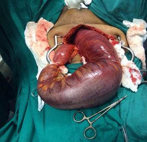 This isn't just a colon, it's a super gigantic megacolon being resected!!! A megacolon denotes dilation of the colon that is not caused by mechanical obstruction. The common and useful measurement for diagnosing it is when the cecum is greater than 12cm (normally varies between 6-9 cm), the rectosigmoid region greater than 6.5 cm and the ascending colon greater than 8 cm. A congenial megacolon is called Hirschsprung's disease, in which nerve cells of the myenteric plexus are absent, it typically affects babies, and therefore isn't the case here. On the other hand, a toxic megacolon is a potentially lethal complication of inflammatory bowel disease or infectious colitis that is characterized by total or segmental nonobstructive colonic swelling and dilatation due to inflammation and accumulation of excessive amounts of gas plus systemic toxicity. Further complications like septic shock, hemorrhage and peritonitis rarely occur. The goal of the treatment is to decompress the bowel and to prevent swallowed air from further distending the bowel. A colectomy (surgical resection of all of part of the colon) is usually indicated if the megacolon worsens.