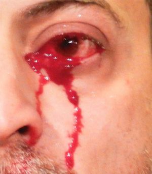 A 52-year-old man presented to the emergency department with painless, bloody tears from both eyes. The bleeding had begun spontaneously approximately 2 hours earlier, had lasted a few minutes, and had recurred just before presentation. He reported no orbital, ocular, or nasal trauma and no history of bloody tears, epistaxis, gingival bleeding, or easy bruising. He was taking captopril for mild hypertension, and his blood pressure at examination was normal. The clinical examination revealed slight conjunctival hyperemia without periorbital or palpebral edema. The patient had normal vision and extraocular movements. The bloody appearance of the tears stopped spontaneously within 1 hour after presentation. Slit-lamp examination revealed hemangiomas on the inside of both eyelids. Hemolacria is a rare condition that is characterized by the presence of blood in the tears. Bleeding associated with tears can occur in the context of infection, inflammation, or trauma to the eye or surrounding structures, vascular tumors of the eye or surrounding structures, or retrograde epistaxis. For the eyelid hemangiomas, the patient began using timolol ophthalmic drops. At 1 year of follow-up, the patient had had no further episodes of bloody tears. Case credit @nejm
