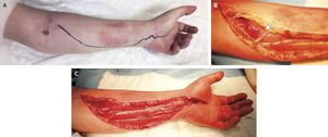 A 26-year-old man presented to the emergency department with a painful, swollen left hand (Panel A). He had been lying on the ground for more than 13 hours after using illicit drugs. The physical examination revealed edema in the left hand and forearm. Active and passive motion of the hand was limited by pain. Sensation was diminished in distributions of the median, ulnar, and radial nerves. Capillary refilling was delayed; the ulnar pulse was palpable, but the radial pulse was undetectable. Laboratory analyses revealed a creatine kinase level of 21,500 U per liter (normal range, 38 to 309). Emergency surgical decompression under tourniquet control showed a demarcation between perfused muscle fibers and ischemic, pale, noncontractile muscle (Panel B, arrow). Perfusion was restored after decompression and release of the tourniquet (Panel C). The compartment syndrome occurs after crush trauma injury or prolonged immobilization, as in this patient. Prompt surgical decompression is critical to reperfuse ischemic muscles and nerves in the compartment. However, even delayed decompression, as in this case, may have the potential to restore perfusion, although full recovery of nerves and muscles may be limited. A second operation that was performed 48 hours after the first procedure showed viable muscle tissue, and the wound was covered with a split-thickness skin graft. The patient did not participate in recommended hand therapy, and hand stiffness and paresthesia persisted. He was subsequently lost to follow-up. Aileen F. Egan, M.B., B.A.O., M.Ch. Kevin C. Cahill, M.D. St. James’s Hospital, Dublin, Ireland source: nejm.org
