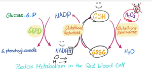 Glucose-6-phosphate dehydrogenase (G6PDor G6PDH) is a cytosolic enzyme that catalyzes the chemical reaction : D-glucose 6-phosphate + NADP+ ⇌ 6-phospho-D-glucono-1,5-lactone + NADPH + H+ The NADPH in turn maintains the level of glutathione in these cells that helps protect the red blood cells against oxidative damage from compounds like hydrogen peroxide. Clinically, an X-linked genetic deficiency of G6PD predisposes a person to non-immune hemolytic anemia.