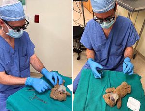 In a sweet gesture, a Canadian surgeon ‘operated’ on a teddy bear at the request of a little boy!! Before heading into surgery for his brain condition, 8-year-old Jackson McKie asked his doctor if he could also fix a tear in his fluffy teddy bear named Little Baby. Dr. Daniel McNeely, a brain surgeon, agreed and performed an operation on Little Baby to stitch it up. McNeely shared the photos of him operating on Little Baby to Twitter, writing “Patient asks if I can also fix teddy bear just before being put off to sleep... how could I say no?” Pictures showed the doctor ready for surgery with gloves and mask on, ‘operating’ the brown teddy bear whose face is covered by a tiny mask! His tweet has since gone viral and has been melting hearts online, and both McKie and Little Baby are recovering well after their surgeries 👨⚕️🐻 (Photos by pdmcneely / Twitter via The Canadian Press)