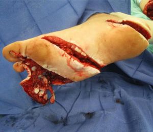 This patient fell from the bow of a boat as it turned. He passed under the boat and was struck by the propeller. He sustained multiple deep wounds over the back, gluteus, and both lower extremities with massive bleeding. The photo shows his right foot with deep parallel lacerations characteristic of propeller cuts. Seven surgical procedures for debridement and reconstruction were required during his initial hospitalization. He also needed four units of whole blood plus intravenous fluid resuscitation. His other leg (not in the photo) needed above knee amputation. After the rehabilitation he has returned to athletic activities while using a sports-specific above knee prosthesis. FOLLOW us @medicalpedia for more extreme medical cases!