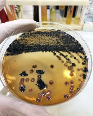 This is picture of fecal cultivation on Salmonella-Shigella agar. Black colonies belong to Citrobacter freundii.