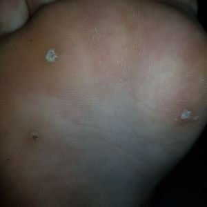 Patient says these lesions appear one and half years ago under her right foot. She says that its little bit painful when she walks with barefoot. Its not itchy but new ones started to appear short time ago (new ones dont grow fast at all)