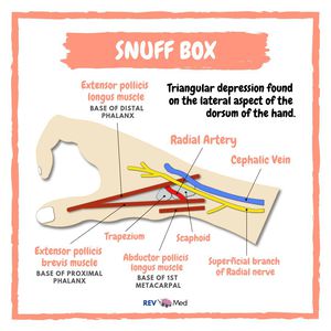 ‘Snuff box’ An area used to snort tobacco & cocaine! As the snuff box is triangularly shaped, it has three borders, a floor, and a roof: Radial (lateral) border: Tendons of the abductor pollicis longus and extensor pollicis brevis. Ulnar (medial) border: Tendon of the extensor pollicis longus. Proximal border: Styloid process of the radius. Floor: Carpal bones; scaphoid and trapezium. Roof: Skin. Contents: The main contents of the anatomical snuffbox are the radial artery, a branch of the radial nerve, and the cephalic vein: Instagram @rev.med Clinical: The scaphoid and the radius articulate to form part of the wrist joint. In the event of a blow to the wrist (e.g falling on an outstretched hand), the scaphoid takes most of the force. If localized pain is reported in the anatomical snuffbox, just think SCAPHOID FRACTURE! The scaphoid has a unique blood supply, which runs distal to proximal. A fracture of the scaphoid can disrupt the blood supply to the proximal portion – this is an emergency. Failure to revascularize the scaphoid can lead to avascular necrosis, and experience of future athritis Stay tuned for special videos in Anatomy on our YouTube channel, link in bio!