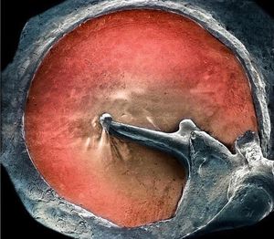 You haven't seen your EARDRUM as detailed as that before! And it looks awesome :) Coloured scanning electron micrograph (SEM) of an eardrum (red). The eardrum, or tympanic membrane, is located in the middle ear. It joins the inner ear through three tiny bones called the ossicles (malleus, incus and stapes). The malleus (centre) is attached to the inner eardrum. It articulates with the incus (right), which, in turn, links to the stapes (not seen). The middle ear transforms sound into vibrations in the fluid of the inner ear, which are then sent as nerve signals to the brain. This procedure enables you to process the sonic waves of whatever hits your ear and therefore recognize voices, noise or music. 📸•Medicogram•