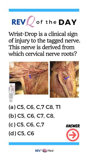 Wrist drip is caused by the damage of the radial nerve bcz it is the one the innervates the extensor muscles . The cervical nerve roots of it are C5 to T1 bcz it originates from posterior cord of brachial plexus .. so A
