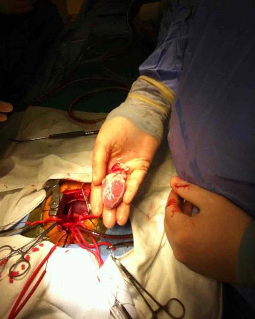 This unique image provides a rare look into a pediatric heart transplant procedure!! The recipient in this case is a 13 month-old patient with congenital heart disease. Congenital malformations are still the most common indication for infant heart transplantation (most common indication is Cardiomyopathy). Infants with serious congenital heart disease generally present in the newborn period with varying degrees of cyanosis, tachypnea, tachycardia, dysrhythmias, poor perfusion, feeding intolerance, and other symptoms of heart failure. An increasing number of congenital lesions are diagnosable by means of fetal ultrasonography. Survival of 20 years after transplantation has been achieved. Most programs now report that more than 70% of their recipients survive at least 5 years. The goal of pediatric heart transplantation is to provide as much of a normal life span for these children as possible.