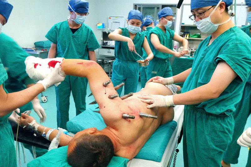 A CHINESE factory worker has survived being skewered with TEN metal spikes when a robot malfunctioned. The 49-year-old, named as Mr Zhou, was working on the night shift at a porcelain factory in Hunan province when he was struck by a falling robotic arm.