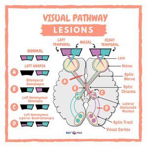 Lesions of the Visual Pathways, with anatomical relationships! Overall the Visual Pathway consist of: *Retina *Optic nerve *Optic chiasm (and there, the nasal visual field fibers cross over to the opposite side) *Optic tract *Lateral geniculate nucleus *Optic radiation *Primary and secondary visual cortices Visual Pathway Lesions! A. Optic Nerve lesion, information cannot even be brought down from that eye, we have complete blindness of the left eye called Left Anopia. B. Optic Chiasm lesion, could be due to a pituitary tumor, Temporal nerves cross over so no information and as a result, blindness from temporal fields called Bitemporal Hemianopia. C. Left Homonymous Hemianopia - a lesion occurs here after optic chiasm, we get a loss of vision from right nasal field and left temporal field. D. Right Homonymous Superior Quadrantanopia - if there is a lesion of just one nerve in the optic tract. So superior quadrant vision of the right nasal field and the right temporal field is lost. Instagram @rev.med Video for this coming soon! Support us by subscribing to our YouTube channel (link in bio) Keep focused and take a good look at this diagram, learn the Anatomy & never forget!