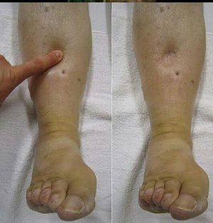 Cutaneous edema is referred to as "pitting" when, after pressure is applied to a small area, the indentation persists after the release of the pressure. Peripheral pitting edema, as shown in the illustration, is the more common type, resulting from water retention.