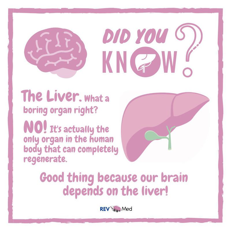 You may not think much of your liver, hidden as it is deep inside your body, but your liver runs a whole lot of functions on your behalf to keep you healthy. Instagram @rev.med This reddish brown organ has two lobes, on the right and the left, and it hangs out just on top of the gallbladder and next to parts of the pancreas and intestines. Your liver and the neighboring organs work as a team to digest and absorb your food. The liver has hundreds of important functions, so don’t underestimate the liver ever again, OK? Learn more with REV Med and understand Anatomy in a fast and easy way by going over to our YouTube channel (link in bio) Follow REV Med on the MEDizzy App! For daily posts!