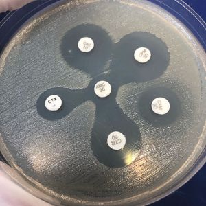 Escherichia coli has grown 70,000 CFU/ml in urine cultivation of a 2 month old boy. You will see a picture of the antibiotic sensitivity test. Stammer is GSBL positive.