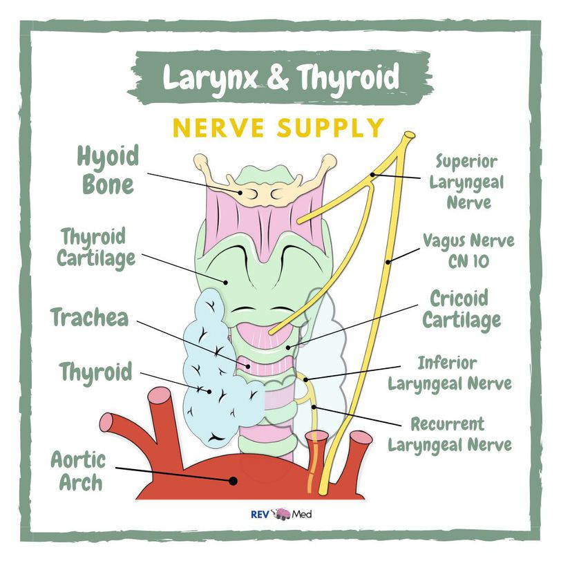 The Larynx Nerve supply brought to you by REV Med on MEDizzy! The larynx is located in the anterior neck and is supspended by the hyoid bone! Following it down, it continues into the Trachea. Larynx Nerve Supply: The recurrent laryngeal nerve and the superior laryngeal nerve are branches of the vagus nerve (CN 10). The Superior Laryngeal Nerve (external branch) innervates the cricothyroid muscle, which tenses and adducts the vocal cords. Injury to the nerve can produce changes in voice quality, but is generally not dangerous. The are two recurrent laryngeal nerves; one left and one right. They arise from their respective vagus nerves, and descend into the chest. In the chest, they hook around the subclavian artery (right RL nerve), or the arch of aorta (left RL nerve). The nerves then ascend back up the neck, running between the trachea and esophagus. They pass underneath the thyroid gland to innervate the larynx. During surgery on the thyroid gland, care must be taken not to ligate or damage the recurrent laryngeal nerves. Check us out on Instagram @rev.med Get a feel for all the nerves in this area and which path they travel, cross reference this with the artery diagram. Want to see more of this? Please support us by subscribing to our YouTube channel! (link in bio) This diagram was Inspired by @the_littlemedic !