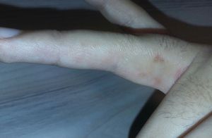 The blisters are now quite well, so it may be a little bit hard to tell but my dermatologist was able to diagnose in a second. What do you say? A) Atopic dermatitis B) Dyshidrosis C) Dermatitis herpetiformis I'll post the answer later if you want me to.