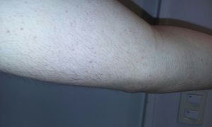 Here's a picture of my left arm. I have the same thing in my right arm and my shoulders. What's your diagnosis? A) Dermatitis B) Queratosis pilaris C) Pili multigenesis D) Allergy E) Acne Here's a piece of information that may or may not be useful, I'm 16 years old.
