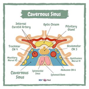 CAVErnous sinus, its basically a cave! Well thats where it gets its name from. Instagram @rev.med This diagram is a coronal cut showcasing the anatomy to be studied. Clinically it is the MOST important SINUS in the human body. Located within the middle cranial fossa next to the sella turcica (where pituitary gland sits) on either side. Traveling through the Cavernous Sinus: *Abducens Nerve Cranial Nerve 6 *Internal Carotid artery In the lateral walls of the Cavernous Sinus: *Oculomotor nerve Cranial Nerve 3 *Trochlear Nerve Cranial Nerve 4 *Ophthalmic V1 & Maxillary V2 branches of Cranial Nerve 5 Trigeminal Nerve. See previous post about the Dural Venous Sinuses to see the exact location along the Cranial cavity. Also stay tuned for our videos on YouTube by subscribing to our channel! (Link in bio)