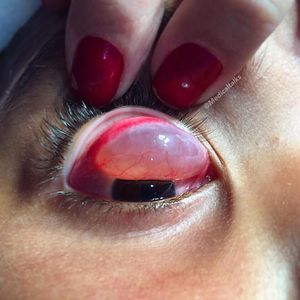 This is a benign cyst filled with clear serous fluid containing shed cells or gelatinous mucous material. Conjunctival inclusion cysts result from traumatic or iatrogenic implantation of conjuctival epithelial cells following trauma or surgery. However, the cysts can develop spontaneously or congenitally during the embryonic period by separation of a portion of conjunctival epithelial cells. The diagnosis of an inclusion cyst is usually made based on a typical translucent cystic appearance of the lesion. However, in cases where bleeding, infection or pigments are present in the intracystic materials, the definite diagnosis may be difficult by clinical examination alone. In this patient, the conjunctival cyst manifested atypically as a large clear, thin-walled mass extending from the conjunctival upper portion to the palpebral surface, and it’s pretty big. Remedy for cysts is complete excision. As the cysts are thin walled, rupture is common during excision. Recurrence is the main postoperative concern so careful and intact removal of cyst is necessary to prevent recurrence. Photo by @gustavo_da_paz