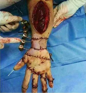 Reemplazando las partes de una mano cortada mediante fijación externa con clavos, tornillos y clavos intramedulares múltiples para las fracturas proximales de la falange.