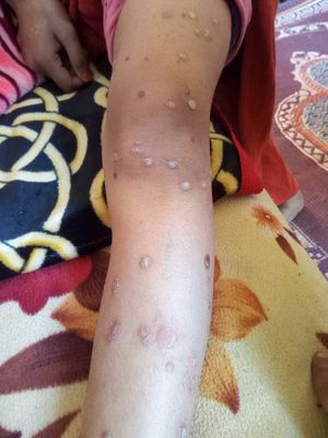 Diagnosis? Tests required? 12 year old girl with no sufficient history presenting with non-pruritic dermal lesions all over body and scalp. Father said her sisters developed the same lesions but recoverd quickly.