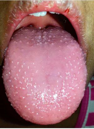 This is literally called a strawberry tongue!! An 8-year-old girl was admitted to the hospital with 7-day history of fever and rash. She had a diffuse macular rash, fissured lips, and strawberry tongue, and her temperature was 39Β°C She had nonexudative conjunctival injection in both eyes, a few enlarged cervical lymph nodes, erythema of the palms and soles, mild edema of the hands, and periungual desquamation. The cardiac examination was normal. A clinical diagnosis of Kawasaki's disease was madeπ Kawasaki's disease is a vasculitis of childhood, It occurs most frequently in children younger than years of age and typically affects medium-sized arteries in any body organ but there is a predilection for the coronary vessels, One extremely characteristic feature is red, dry cracked lips and an extremely red, swollen tongue (strawberry tongue) Other symptoms are fever, conjunctivitis lymphadenopathy, and mucocutaneous inflammation (erythema of lips, tongue, palate; peripheral edema, desquamation, and generalized rash) Accurate diagnosis and early therapeutic interventions can decrease the risk of coronary artery abnormalities. There is no diagnostic test that is specific for Kawasaki's disease, diagnosis is based on characteristic clinical findings and the exclusion of other possibilities in the differential diagnosis, including other infectious exanthems of childhood and reactions to drugs. She was treated with aspirin and immune globulin on admission and at a follow-up visit 8 weeks later.