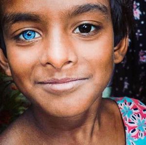 Heterochromia is a difference in coloration, usually of the iris but also of hair or skin. Heterochromia is determined by the production, delivery, and concentration of melanin (a pigment). It may be inherited, or caused by genetic mosaicism, chimerism, disease, or injury. It occurs in humans and certain breeds of dogs and cats.