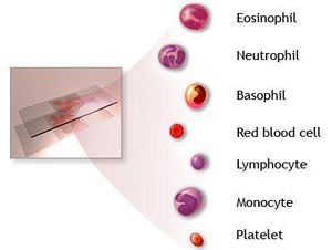 RBC - 8.5µm, WBC - 12 to 20pm, Neutrophils - 12 to 17µm, Basophils - 14 to 16µm, Esoinophils - 10 to 12µm, small lymphocytes - 7 to 10µm, large lymphocyte - 12 to 15µm, Platelets - 2 to 3µm
