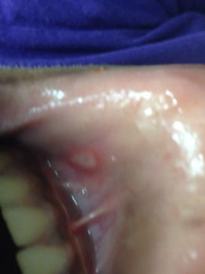 Maybe u should think something like crohns or behcet vasculitis in serious conditions or something much simpler tell her to try a mouthwash solution like eludril mouthwash( maybe its just a mouth ulcer)