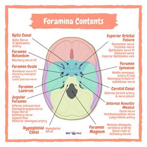 Detailed review! See notes below for mnemonic and tips to remember everything 3 SMALL Sized Opening (foramina of middle) *Sternomastoid Foramen *Foramen Spinosum *Foramen Ovale 3 LARGE Laceration of Artery and Vein (foramina of middle) *Foramen Lacerum *Carotid Canal *Jugular Foramen Foramen Ovale contents: OVALE *Otic ganglion *V3 cranial nerve *Accessory meningeal artery *Lesser Petrosal nerve *Emissary veins Trigeminal Nerve relations (foramina) Standing Room Only *Superior Orbital Fissure V1 *Foramen Rotundum V2 *Foramen Ovale V3 Superior Orbital Fissure (structures passing through) Live Free To See No Insult At All *Lacrimal Nerve CN V1 *Frontal Nerve CN V1 *Trochlear CN 4 *Superior division of Oculomotor nerve CN 3 *Nasociliary nerve CN V1 *Inferior division of Oculomotor nerve CN 3 *Abducens Nerve CN 6 Review this a few times, if you need larger image of this then please ask me for a download. Subscribe to our YouTube Channel and show us support (Link in Bio) Instagram @rev.med