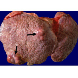Cirrhosis of the liver in hepatitis C and hepatocellular carcinoma. Congenitally remodeled liver parenchyma with several larger nodules. The larger nodes to which the arrows point are foci of hepatocellular carcinoma.