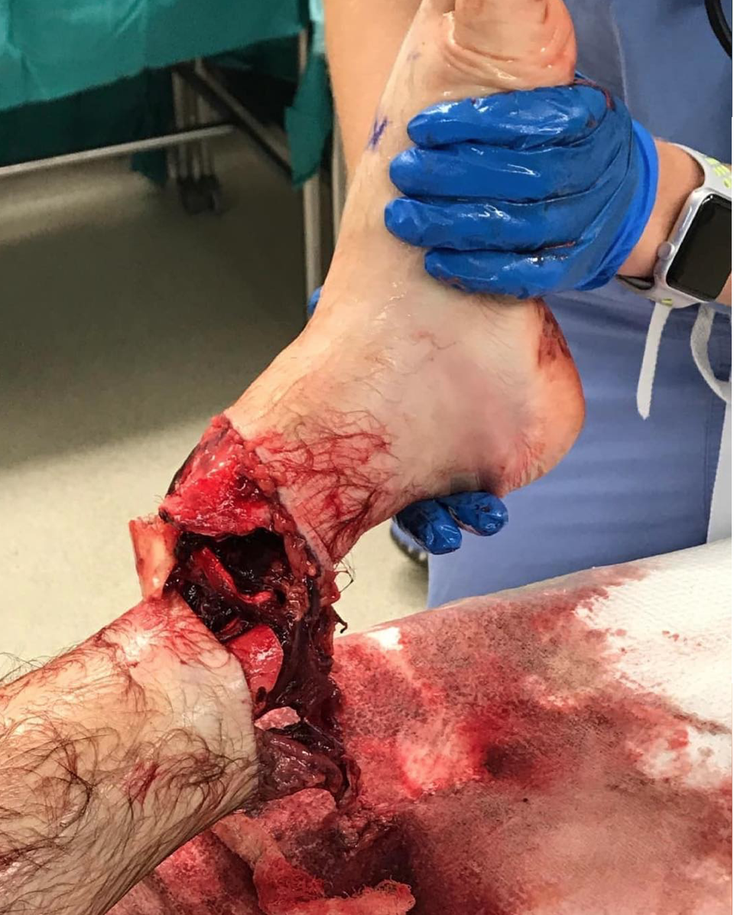 A case of a motorcycle accident! The patient was going 60mph when he slid and his ankle hit a stop sign. Surprisingly, he had pulses going into surgery but ended up amputating a week later due to infection. Sub-amputation of the limbs is typically the result of high energy traumas with a combination of crushing, traction and bending forces. The skin is often peeled, with wide loss of substance caused by avulsion or ischemia. The fascial compartments are often partially opened because of explosion or laceration and the muscular tissues are locally and regionally damaged by direct and indirect lesions. The decision to amputate or save the severely lesioned lower limb is difficult. Attempts at quantifying the severity of the trauma and to establish numeral guidelines in order to decide to amputate or save a limb have been suggested by several authors. The score systems of lower limbs include the Mangled Extremity Severity Score (MESS), where age, shock, contamination level and treatment time are some of the deciding factors. Credit: codebrownRN Credit: @savageparamedics