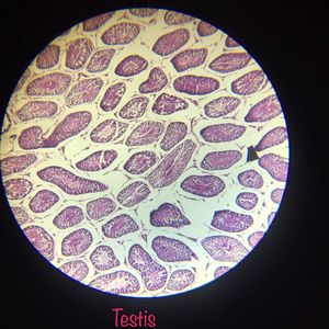 TESTIS..Numerous seminiferous tubules, interstitial cells of leydig present, sertoli cells in seminiferous epithelium