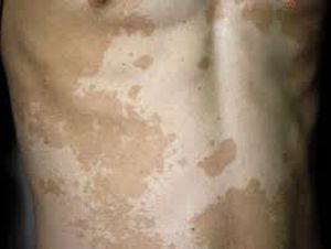 A young woman with seborrhea adiposa has numerous non-itchy light brown and white spots with clear outlines and defurfuration on the torso and shoulder skin.