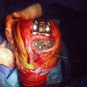 The diseased knee joint is replaced with artificial material. The knee is a hinge joint which provides motion at the point where the thigh meets the lower leg. The thighbone (or femur) abuts the large bone of the lower leg (tibia) at the knee joint. During a total knee replacement, the end of the femur bone is removed and replaced with a metal shell. The end of the lower leg bone (tibia) is also removed and replaced with a channeled plastic piece with a metal stem. Depending on the condition of the kneecap portion of the knee joint, a plastic "button" may also be added under the kneecap surface. The artificial components of a total knee replacement are referred to as the prosthesis.
