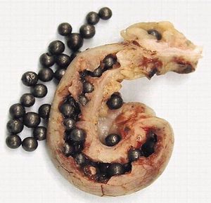 An 8-year old hyperactive boy was admitted in hospital after having been found to have elevated blood levels ranging from 17.4 to 27.4 ug per decilitre (reference range <10) over a period of 2years .an abdominal radiograph revealed small ,hyper dense foci in the rt.lower quadrant.the entire family reported that they are geese daily that was killed with lead pellets from the short gun.and children reported that they were eating pellets as a part of the game to make them disappear.the patient and siblings underwent bowel washout.A follow up radiograph of patient showed that there were still pellets present in the gastrointestinal tract .in either the cecum or the appendix.laproscopic appendectomy was performed .the appendix weighed 27.5 grams(normal weight 4-5g) measured 55mm lean goth and had an average diameter of 7mm with a wall thickness of 2 mm .a total of 57 lead pellets were removed from the lumen . Microscopical examination of appendix showed minor changes with a focus of submucosal calcification and fibrosis.No acute inflammation was observed.