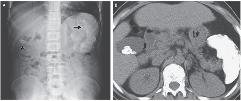 A 35-year-old man presented to the gastroenterology clinic for treatment of chronic hepatitis C virus (HCV) infection. He had a type of sickle cell disease, hemoglobin Sβ thalassemia, with recurrent, episodic abdominal pain that had been present since childhood. A complete blood count showed microcytic anemia. The total bilirubin level was 8.5 mg per deciliter (145 μmol per liter; reference range, 0.3 to 1.2 mg per deciliter [5.1 to 20.5 μmol per liter]) and the indirect bilirubin level was 6.2 mg per deciliter (106 μmol per liter; reference range, 0.1 to 1.0 mg per deciliter [1.7 to 17.1 μmol per liter]). A peripheral-blood smear showed microcytic and hypochromic red cells, target cells, nucleated red cells, and sickle cells. An abdominal radiograph, which was obtained during a previous presentation for abdominal pain, showed a radiopaque gallstone (Panel A, arrowhead) and a calcified spleen (Panel A, arrow). A computed tomographic scan of the abdomen, obtained without the administration of contrast material, showed multiple gallstones and a calcified splenic pulp and capsule (Panel B). Pigment gallstones may occur as a result of hemolysis. Bilirubin stones, which are normally radiolucent, can be radiopaque when bilirubin binds with calcium. This patient completed treatment for chronic HCV infection, and he was vaccinated against encapsulated organisms. He has continued to do well on follow-up visits. Ankur Gupta, D.M. Priyanka Jain, M.D. Max Super Specialty Hospital, Dehradun, India source: nejm.org