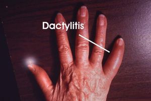Dactylitis is inflammation of a digit (either finger or toe) and is derived from the Greek word dactylos meaning finger. The affected fingers and/or toes swell up into a sausage shape and can become painful. _common Causes are: •Infection Blistering distal dactylitis Tuberculous dactylitis Syphilitic dactylitis •Spondyloarthritis •Gout •Sarcoidosis •Sickle-cell dactylitis
