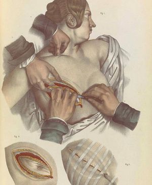 This illustration demonstrates a mastectomy (Removal of breast) from 1841. Back then there was no anesthesia, nor antibiotics. Thus, the operation was painful and dangerous.