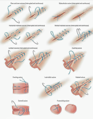 As we all know when a Doctor performs operation how many small small things he or she needs to alert about... So here are one of them.! - Many varieties of suture materials and needles are available. The choice of sutures and needles are determined, by the location of lesion, the thickness of the skin on that location and the amount of tension exerted on the wound. Regardless of the specific suture and needle choosen, the basic technique of needle holding, and needle driving, and knot placement remain the same. • Different types of surgical sutures - Simple interrupted suture. The most commonly used and most versatile suture in cutaneous surgery is Simple interrupted suture. •Simple running suture(continuous) It is essentially an uninterrupted series of Simple interrupted suture. •Running locked suture It may be either locked or left unlocked. • Vertical mattress suture It is a variation of Simple interrupted suture. •Half-burried vertical mattress suture It is a modification of vertical mattress suture that eliminates two of the four entry points, thereby reduce scarring. •Pulley suture It is a modification of vertical mattress suture. •Far-near near- far modified vertical mattress suture; Another stitch that serves the save function as a pulley suture is a Far-near near-far modified vertical mattress suture. •Horizontal mattress suture It is placed by entering the skin 5mm to 1cm from the wound edge. •Dermal-subdermal sutures It is placed by inserting the needle parallel to the epidermis at the junction of the dermis and the subcutis. •Buried- horizontal mattress suture It is a purse-string suture.