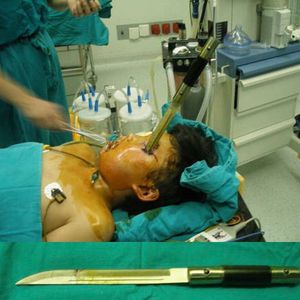 Lucky to be alive - a 20cm long knife embedded 7cm into his face! The stunning X-ray image shows a knife stuck deep inside a Chinese teenager's cheek. The 13-year-old tripped and fell while peeling an apple, jamming himself in the face with a nearly 8-inch knife. His father recalled "He was walking to the sofa while peeling the apple. Suddenly he slipped down and his face hit onto the sharp knife. I dared not pull out the knife as my son was screaming." Amazingly, the blade did not strike the boy's brain and doctors were able to remove the knife, expecting him to make a full recovery.