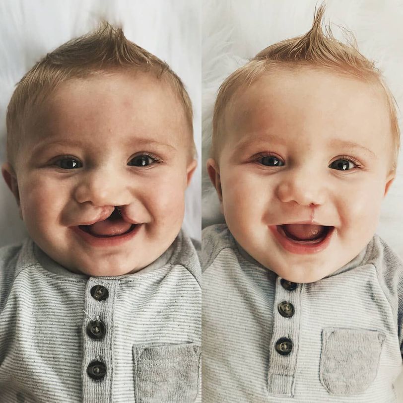 Two weeks post surgery . This little rockstar is still as happy as ever and looks just as cute as ever- only now we have the added bonus of an upper lip and a nose! . Cleft lip and cleft palate are birth defects that occur when a baby’s lip or mouth do not form properly during pregnancy. Together, these birth def ects commonly are called “orofacial clefts”. . The lip forms between the fourth and seventh weeks of pregnancy. As a baby develops during pregnancy, body tissue and special cells from each side of the head grow toward the center of the face and join together to make the face. This joining of tissue forms the facial features, like the lips and mouth. A cleft lip happens if the tissue that makes up the lip does not join completely before birth. This results in an opening in the upper lip. The opening in the lip can be a small slit or it can be a large opening that goes through the lip into the nose. A cleft lip can be on one or both sides of the lip or in the middle of the lip, which occurs very rarely. Children with a cleft lip also can have a cleft palate. . The roof of the mouth (palate) is formed between the sixth and ninth weeks of pregnancy. A cleft palate happens if the tissue that makes up the roof of the mouth does not join together completely during pregnancy. For some babies, both the front and back parts of the palate are open. For other babies, only part of the palate is open.